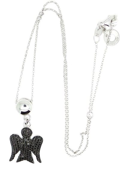 collana in argento rodiato, lunghezza totale 46 cm, con pendente a forma di angelo in zirconi neri a pavè, chiusura a moschettone