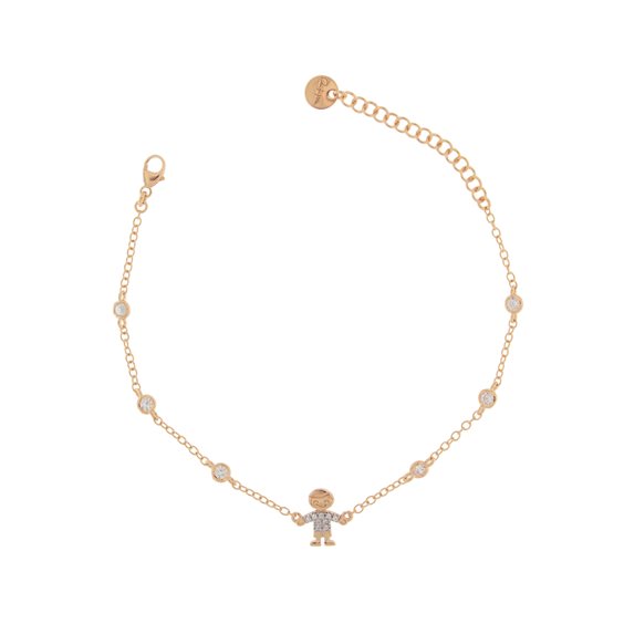 Bracciale a catena della collezione Rue Des Mille Stardust Tales da donna. Colore: oro rosa. Il gioiello è in argento 925‰ con placcatura oro rosa 18kt composto da catena con zirconi bianchi e soggetto centrale bimbo. Misura regolabile con chiusura a moschettone.