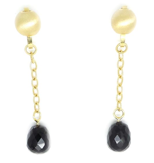 Orecchini in oro giallo 18 kt com pietra sfaccettata in onice nero e attacco a pallina satinata con chiusura perno e farfalla.