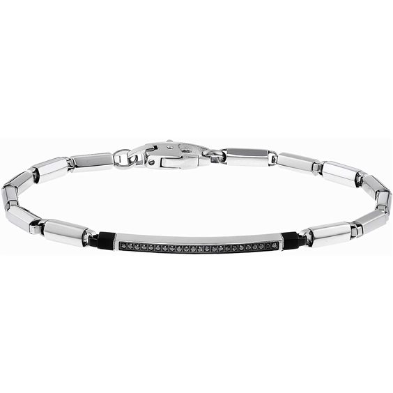 bracciale in acciaio, bianco lucido e con trattamento pvd nero, chiusura moschettone, inserti di spinelli neri naturali, lunghezza totale 22 cm